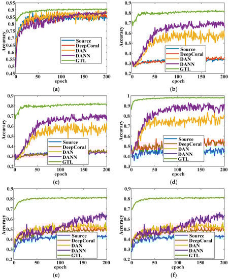 The changes of accuracy with epoch at six transfer tasks: (a) H→M; (b) H→L; (c) M→H; (d) M→L; (e) L→H; (f) L→M.