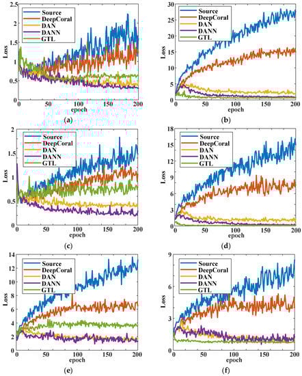 As one can see from Figure 7, in tasks H→M and M→H, the GTL method was slightly better than the other methods at the whole training process. For tasks where data distributions were distant, i.e., H→L, L→H, M→L, and L→M, the GTL showed a powerful ability of domain adaptation that converged faster. It also had better classification performance that was higher than the other methods by at least 10%. Source and DeepCoral showed poor performance in these four tasks and became stable at around the 50th epoch. DAN and DANN performed better than these two methods but still converged slower than the GTL method. The proposed GTL method not only performed better than the other methods but also converged faster at some transfer tasks. As the accuracy trend shows, it became stable at around the 20th epoch. The loss trend for the six transfer tasks are shown in Figure 8. As there was no training indicator to guide the adversarial training, the test loss curve was chosen to represent the convergence trend. However, the precision and recall significantly influenced the test loss. As can be seen in Figure 8a,c,e, the test loss of GTL was higher than DAN and DANN, as was the accuracy. For instance, at the transfer task L→H (Figure 8e), the accuracy of GTL (0.8143) was higher than the others, but the precision (0.5044) and recall (0.3340) were far lower than others. As a result, the test loss of GTL was higher than DAN and DANN. However, at distant domain transfer tasks, the GTL converged faster than the other four methods. Another interesting finding was that the accuracy of GTL in the first epoch was better than all the other algorithms, with all six tasks achieving over 70%. This proves that adversarial domain adaptation training can easily find better initial parameters for optimization. It should be noted that the methods that were compared have the same net architecture and hyperparameters. The loss function of DAN and DeepCoral is negative log likelihood loss, while the loss function is cross-entropy loss for the other methods.