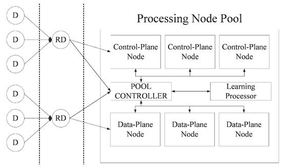 The system consists of dust devices, relay dust devices, processing node pool, pool controller, and learning processor. Dust devices are very small sensors that collect information about the environment around them, and which may or may not also have a very small amount of computing power. Relay devices are the same as the dust device, and only add the ability to relay packets to the dust device. That is, the relay device is a dust device capable of transmitting data of a lower node to an upper node of the network. A processing node pool is a group of nodes called processing nodes. These have either a data or a control plane depending on the type of packet that they can process. If a node has control planes, it becomes a control plane node (CP-Node); if the node has data planes, it becomes a data plane node (DP-Node). Their roles are not fixed, and can be switched by the pool controller depending on the ratio of packets in the current system. The pool controller requests the learning processor to predict the ratio of processing nodes that is most suitable for the current system, and manages the ratio of processing nodes according to the predicted ratio. The learning processor that predicts the ratio of CP-Nodes to DP-Nodes is the focus of this paper.