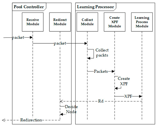 When a packet is received from the outside of the system to the receive module of the pool controller, the packet is immediately delivered to the learning processor. The learning processor collects the received packet using an internal collector module to process the packet into the appropriate data used by the system. The collected packets are made of eXtended Permuted Frame (XPF) to serve as training data. XPF is used as training data to train the network. After that, it returns the Rd (the ratio of data plane) that is learned by the module responsible for learning to the pool controller. The pool controller, which grasped the packet trend of the entire system with Rd, selects a suitable control-plane node in the system and handles the packet. Figure 2 illustrates this process.
