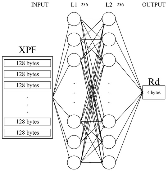 The training data input to the network is provided in the form of eXtended Permuted Frame (XPF), which will be described later. At this time, the data of each XPF is transformed into one dimension and provided to L1 which has 256 nodes. In the final stage of the learning network, L2 uses the Softmax function [16] to output real values (4 bytes). We also use Adam [19] as an optimizer to train nodes on the network (learning rate = 0.001, epoch = 10).