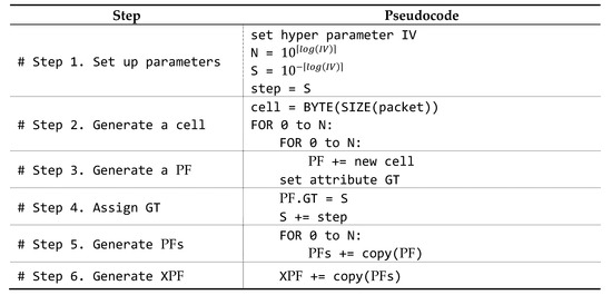 In step 1, the hyper parameter IV is set, and the other parameters (N and S) are calculated from it. When calculating N and S, Equations (3) and (4) are used, as previously described. In step 2, we create a cell, the smallest unit of the proposed algorithm. A cell is made in the same size as a packet because it is created to store a packet. A cell can be recognized as a packet with all bytes set to zero. A cell is an empty packet. In step 3, the cell is duplicated to create a PF. This step simply repeats N times. Since all cells in a PF share the same GT, one GT property is sufficient. The GT is the ratio of the data plane node. In step 4, the GT shared by all cells is initialized to S. After being assigned to a GT, S increases by step (like the first S calculated). The step is assigned the same value as S when S is first calculated. In other words, step is the step by which the ratio increases. In step 5, PF is duplicated N times to create PFs. The reason for the need for PFs is that even within the same ratio, the internal packet configuration can be different. For example, when 1 means data packet and 0 means control packet, 1100 and 0011 look like completely different combinations, but GT in the PF is 0.5 for both. The final step is to duplicate the various combinations of PFs N times to create an XPF. PFs have only one GT because the PFs in the PFs share the same GT. As such, it is necessary to extend the PFs with a combination of PFs composed of various ratios, which is called XPF.