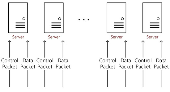 One way to solve the above problem is to apply Intel’s (Santa Clara, CA, USA) Dual Plane Development Kit (DPDK) [11,12] to your system to speed up data processing. This type of approach has been very effective in terms of achieving increased throughput, but resulted in a new issue that reduces the throughput when signal packets and user data packets are mixed in similar proportions, because DPDK does not support dynamic partitioning [13,14,15]. This problem is called the mixed packet problem [3,14]. The problem is even more pronounced when the ratio of packets changes dramatically. In other words, throughput reduction is more pronounced when the ratio is constantly changing with the two types of packets intermingled, and especially when the rates of the two types of packets are similar [14]. In this paper, we propose an algorithm that avoids rather than eliminates the mixed packet problem by estimating the ratio of planes. We also then go a step further and reproduce various situations and compare them with the system with our solution.