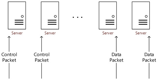 We have dealt with eight 4-byte data in our previous studies [12,14,15] and dealt with network environments using TCP/IP. The system is also designed to run on top of the system from previous studies [15]. The packet of the previous study designed a 32-byte space that can handle 40 bytes of TCP/IP headers, 40 bytes of routing information for indicating internal paths, 4 bytes of packet type information and 32 bytes of sending data (8, 4 bytes). In addition, a total of 128 bytes of packets were designed with an extra 12 bytes of space for ease of expansion by adding data [15].
