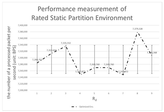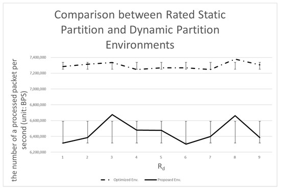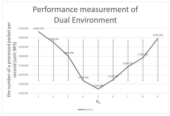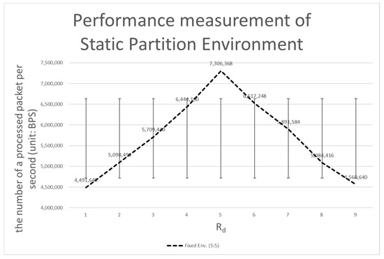 The static partition environment solves this problem well, as it is a method designed to solve the mixed packet problem of the dual environment. However, the static partition environment poses the opposite problem to the dual environment. The performance issue related to extreme bottlenecks (see if Rd = 5 in Table 4) is resolved, but the performance of the remaining area is degraded. If Rd is 1, when there is a sudden flood of control packets, most of the control packets cannot be processed, so another bottleneck results (due to the lack of flexibility of the static partition environment). As can be seen in Figure 13 below, when Rd is set to 5, the performance of Rd at the pole (if Rd is 1 or 9) is degraded.