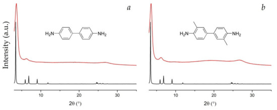 COFs showed a typical crystallinity for this kind of material exhibited a significant pick under 5° 2θ, exactly at 3.6° 2θ for both COFs (TFP-BZ and TFP-DMBZ) corresponding to the (100) plane and more picks at 6.2° 2θ and 26.6° 2θ corresponding to the (110) and (001) planes, respectively. The diffraction patterns are practically the same for both materials (Figure 1), since the chemical structures of the two COFs are very similar, as was reported previously [44].