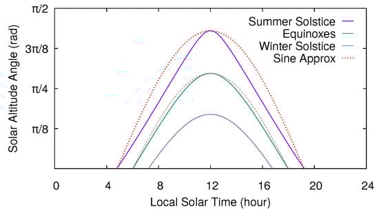 Among other factors (atmospheric effects, cloud cover, air pollution, and so on), solar irradiance on the surface of a solar cell depends on the angle of incidence of the sunlight on it and, therefore, on the height of the sun above the horizon. The altitude angle (or elevation angle) is the angular height of the sun in the sky measured from the horizon. The altitude angle varies throughout the day and depends on the observer’s latitude and the day of year (see Figure 1). Certainly, the altitude angle is zero at sunrise and sunset times, and solar irradiance is negligible between the sunset of a day and the sunrise of the next day. From sunrise, the altitude angle (and, therefore, solar irradiance in the absence of changes in atmospheric conditions) increases following, approximately, a sine curve. The maximum solar irradiance is achieved at noon, the time when the sun apparently reaches its highest point in the sky. Finally, from noon to sunset, the altitude angle (and thus the solar irradiance) decreases in a symmetrical way.