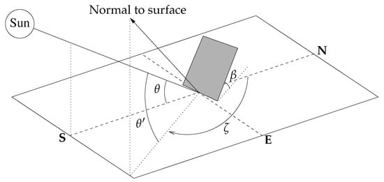Clearly, the angle of incidence of the sun on a horizontal surface coincides with the solar altitude angle. However, the angle of incidence varies in the case of a tilted surface (see Figure 2). The solar incidence angle on a surface tilted at an angle from the horizontal can be calculated using the following formula: