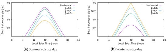 Usually, solar cells are aligned to face the equator. Thus, solar cells in the northern hemisphere will typically face directly south (), while those in the southern hemisphere will face directly north (). Figure 3 shows how the solar incidence angle varies on a tilted surface facing the equator at different tilt angles. Note that, through the course of the summer solstice day, the incidence angle at a particular time decreases as increases. Contrarily, the incidence angle increases with during the winter solstice day. Consequently, steeper tilt angles are preferred during the winter in the northern hemisphere, whereas lower tilt angles enable solar cells to capture more sunlight during the summer. In any case, although the surface slant clearly modifies the solar incidence angle, this consistently follows a curve similar to that obtained for a horizontal surface, so our energy model should perform well even for those tilted cells with an unknown tilt angle.