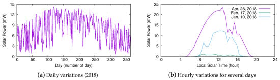 We evaluated the performance of Pro-Energy, UD-WCMA, and Solar Altitude Angle (SAA) predictors using an open-source in-house simulator []. We employed real solar traces obtained from the National Renewable Energy Laboratory (NREL) at Oak Ridge, Tennessee []. Each original trace contains one sample per minute of the radiant energy on the solar cell in a given day. From the raw irradiance values I, the harvested power has been estimated as , where is the efficiency factor of the solar cell, and A is the area of the cell surface. As in [], we considered and 22 7. In addition, we set the number of timeslots per day N to 48, so we stored in each energy profile the average solar power harvested at each 30 interval. Figure 4 depicts the average power harvested from sunrise to sunset for each day of the year 2018 and the power harvested at different times of several representative days for the given location. Note how solar power harvesting significantly varies from one day to another and at different times of the same day.