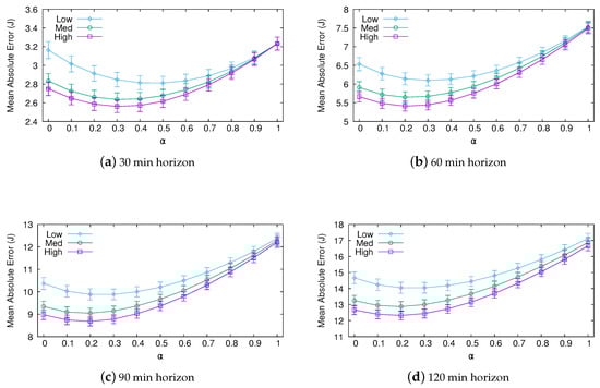 Figure 5 shows the MAE for both the short-term (30 and 60 ) and medium-term (90 and 120 ) predictions obtained with Pro-Energy (95% confidence intervals are shown in the graphs). As expected, prediction errors are greater as the prediction horizon moves away, and the most accurate predictions are achieved using the setting with the highest overhead. Note that the parameter greatly impacts performance. The optimal weighting factor takes values from for the 30 predictions with the low overhead settings to for the 120 predictions with the high overhead settings. Not surprisingly, the relative significance of the last measured energy value (that is, the weighting factor ) must be diminished as the prediction horizon moves away.
