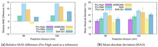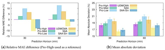 Figure 6 shows the short-term prediction results obtained with the different estimation methods—in particular, their MAD—and the relative difference between the MAE obtained with each of the predictors and that obtained with Pro-Energy when configured with the high overhead settings (Pro-High), since this is the best performing alternative. Noticeably, and despite its apparent simplicity, the MAE obtained with the SAA model is % and % lower than that obtained with Pro-High at 30 and 60 prediction horizons, respectively. Moreover, even the simplified SAA model using the sine approximation (SAA-Sine) reduces the MAE obtained with Pro-High by % and % at 30 and 60 horizons, respectively. On the other hand, the UD-WCMA technique is able to slightly improve the predictions given by Pro-Energy with the low overhead settings (Pro-Low) only, but its estimations are much less accurate than those obtained with our proposal.
