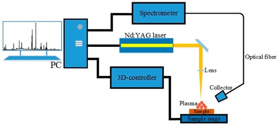 A schematic diagram of traditional LIBS experimental setup is shown in Figure 1. In air, the laser used here is Nd: YAG laser (type: Quantel Ultra 50; wavelength: 1064 nm; repetition rate: 10 Hz; pulse duration: 10 ns; pulse energy: 200 mJ) from Quantel. The emission of the plasma was collected by using a one-inch diameter quartz lens and is introduced to an optical fiber which is couple to a seven-channel wide-spectrum spectrometer (AvaSpec-ULS2048-7-USB2 from Avantes, Netherlands). At the same time, the spectrometer is equipped with a 2048 pixels CCD detector, covering the spectral range from 190 to 950 nm with a resolution of 0.05 nm, which can be triggered by an external TTL level, or an output level trigger external device. The focusing lens is 36 mm in focal length to focus the pulse on sample surface. The sample is placed on a sample stage with freely controllable XYZ axis. The stroke of the stage is 5 cm and this can realize the micron level (<1 um) high precision positioning control.