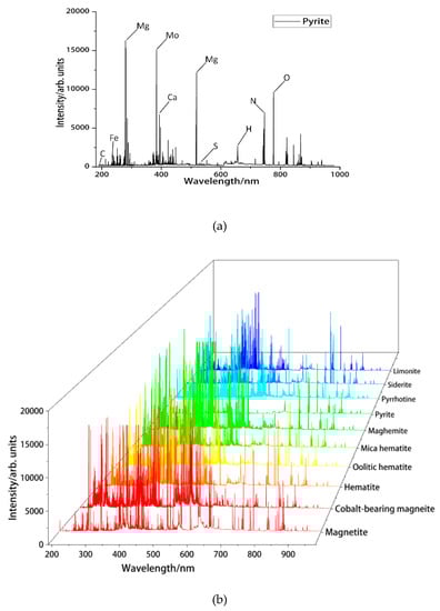 Since the spectrum of other ore is too dense, the spectrum of pyrite is used to represent the general elements and it is shown in Figure 2a. According to the National Institute of Standards and Technology (NIST) [38], the nonmetallic elements (C, H, O, N, S) and metallic elements (Mg, Ca, Mo, Fe) were observed.