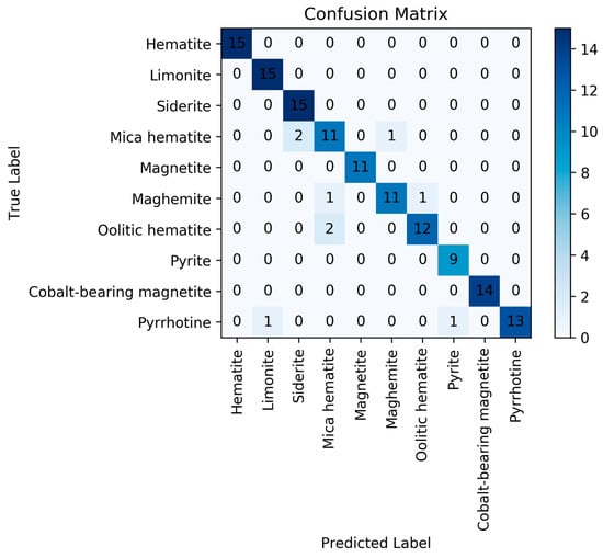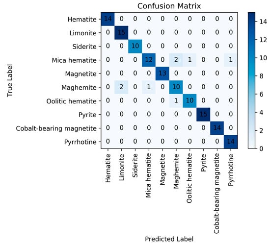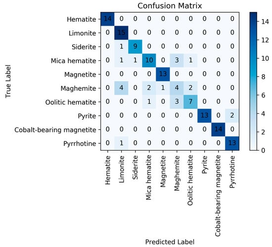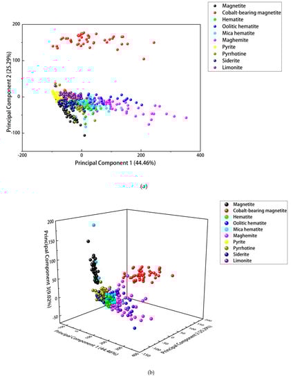 Each point represents a set of data. It can be seen from Figure 4a,b that characteristic points of the same type of ore appear as obvious aggregation. Cobalt-bearing magnetite was found to be clearly separated from the other ores, which could be attributed to the fact that its spectral intensity and species are significantly higher than other classes. For the remaining nine ores, the data points distributed in space were mixed to a greater or lesser extent. Magnetite, pyrite, siderite, and limonite could be distinguished in 2D space. The difference between pyrite and pyrrhotite was also obvious. On the contrary, the distribution of mica hematite and hematite in 2D space basically coincided, indicating that the characteristics of the two ores were similar. Both maghemite and oolitic hematite were widely distributed, indicating that the composition of these two ores was more complicated.