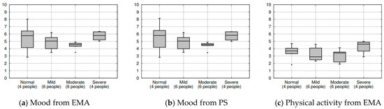 Figure 11e,f shows the sleep data from EMA and passive sensing data, respectively. In both figures, the sleep duration does not seem to vary much among the groups, but it does seem to gradually decrease from the normal group to the severe group. These two figures show an interesting point. In the EMA, participants believe that they sleep more hours from a subjective viewpoint, but they actually sleep less from an objective viewpoint (i.e., the passive sensing data). Figure 11g,h shows the social activity from EMA and passive sensing data, respectively.