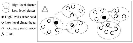High-level cluster head: In the three-layer sensor network, sensor nodes are separated to play different roles, such as cluster heads and ordinary nodes. First, all nodes are grouped into low-level clusters and the low-level cluster heads are elected by a cluster algorithm. Then, the low-level cluster heads are organized into high-level clusters and high-level cluster heads are elected. A high-level cluster head is expressed by , where is the identification of the high-level cluster head.