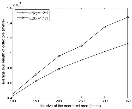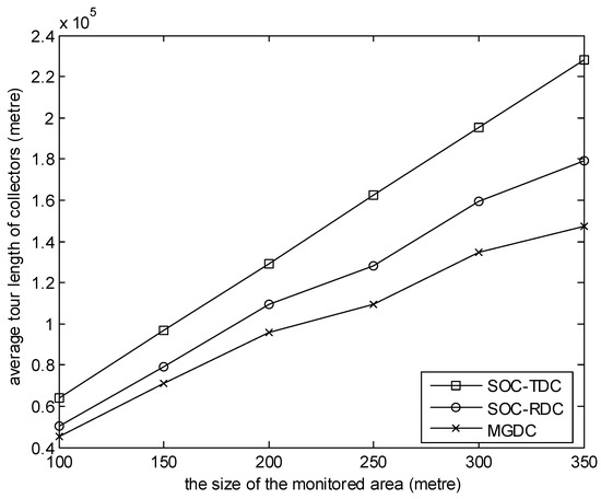 In the simulations shown in Figure 2, Figure 3, Figure 4, Figure 5 and Figure 6, Equation (38) is satisfied. Figure 2 shows the relationship between the average tour length of collectors and the size of the monitored area during the simulation time. In the simulation, the number of collectors is 8, and the number of sensor nodes is 100. It can be observed from the figure that, with MGDC, the average tour length of collectors is smaller than that of SOC-RDC and SOC-TDC, and with the increase of the size of the monitored area, the gap between them increases. There are two reasons for this result. One reason is that, using SOC-TDC, the data packets generated at the same time are collected by one collector. These data packets may be scattered over different regions, so the collector moves a long distance to collect them. According to the MGDC, during a collection cycle, a collector only visit a high-level cluster head, so it moves a short distance. Another reason is, according to SOC-RDC, data packets generated at the same time are collected by several collectors, not one collector. Some collectors may select the same region. Under this circumstance, the sink randomly selects one of these collectors to collect data packets in this region. The choice may not be optimal. However, the matching result of MGDC between collectors and high level cluster heads is optimal. With the increase of the size of the monitored area, the distribution of sensor nodes is becoming more and more dispersed, so the advantages of MGDC are becoming more and more obvious.