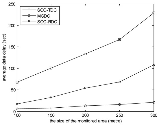 Figure 6 evaluates the effect of the number of sensor nodes on the average data delay. In this experiment, the number of collectors is 6, and the size of the monitored area is 400 m. As illustrated in Figure 6, when the number of sensor nodes increases, the average data delay increases. The reason is that, when the number of nodes is small, the number of high-level cluster heads is small, and there are few optional objects for collectors. The gap between MGDC and SOC-RDC is not obvious. With the increase of the number of sensor nodes, the number of clusters and nodes which have monitored events increases. There are more optional objects for collectors, and the gap between MGDC and SOC-RDC becomes more and more obvious.