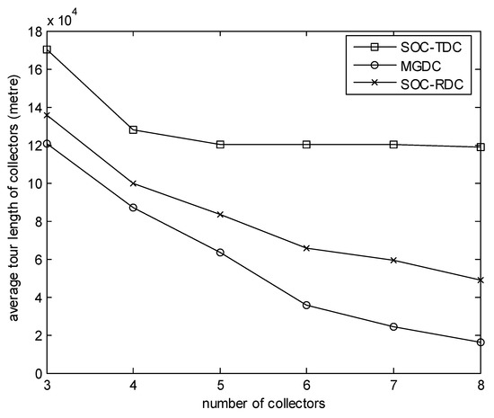 Figure 4 focuses on the effect of the number of collectors on the average tour length of collectors. In this experiment, the number of sensors is 100, and the size of the monitored area is 100 m. We can observe that when the number of collectors is small, the advantage of MGDC is not obvious. This is because, during the simulation time, when the number of high-level cluster heads which have received data packets is greater than the number of collectors, one collector needs to visit several cluster heads. The average tour length of collectors is long. Furthermore, when the number of collectors is small, the options of cluster heads are few, and the difference between SOC-RDC and MGDC is not obvious. However, when the number of collectors increases, the combinations between cluster heads and collectors increase, and the advantages of MGDC become more obvious. Since the data packets generated at the same time are collected by one collector according to SOC-TDC, as the number of collectors increases, some collectors are idle. Hence, for SOC-TDC, as more collectors are added, the impact on average tour length of collectors is not significant.