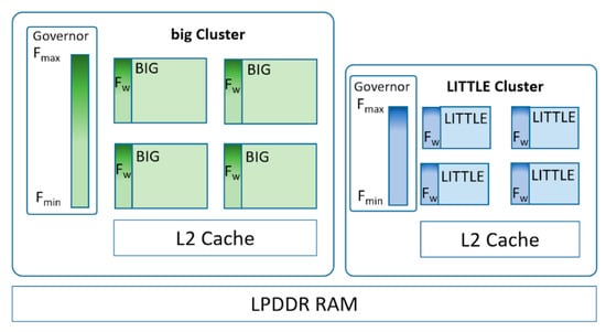 In a big.LITTLE ARM architecture (see Figure 2) each type of core has a minimum frequency (Fmin), a maximum frequency (Fmax), and a range of frequencies available between these two, so that, depending on the policy applied by the governor, and the computer load required by the process, one particular frequency will be chosen as the working frequency (fw), a value that can change continuously during the execution of the task. These governors can apply a static or dynamic frequency assignment policy. As a static, there is the Powersave governor, where fw = Fmin, and the Performance governor, where fw = Fmax. The dynamic governors will make the fw value go up and down through the available frequencies between Fmin and Fmax with the objective of executing the tasks in a satisfactory time alongside a reduction in the energy consumption. Common examples of dynamic policies are the Ondemand, Conservative, and Interactive governors. These are naive algorithms [22], which means that appropriate configuration may give a significant improvement in consumption. Using Ondemand, if the load on the core exceeds a certain threshold, fw = Fmax will be set, and a gradual reduction of fw will be performed until fw = Fmin is reached, as the load on the core decreases. Conservative has a more gradual way of raising the fw value, and a progressive decrease when the load drops from the lower threshold. The Interactive governor was designed for interactive workloads that require a fast reaction in response to user actions. In addition, the procedure for adjusting the fw value is in the kernel with the highest priority, in order to avoid delays in response. This governor, has a series of parameters that allow the operation to be regulated according to the relationship between performance and energy to be achieved. Table 1 shows a description of these parameters, and Table 2 shows the default values used and those proposed here.