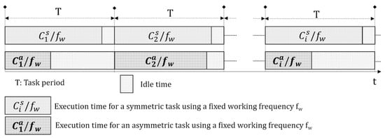 The approach is that the flexible node IoMT will be executing a certain task at a given time with a periodicity T. The algorithm to be executed in each period may be symmetric and invariant to the content, so that its execution time () in each period T will be constant if used at the same frequency fw (). In this case, a static governor can be chosen using a fixed frequency fw, between Fmin and Fmax so that , and in this way the temporal requirements of the application are satisfied. Given the quadratic relationship between energy and frequency, the lower the fw, the lower the consumption. In the case of an asymmetric algorithm, where the execution time () is not constant but depends on the content of the images, the use of another certain fixed frequency fw means that there is sometimes too much idle time, while in other cases there may be very little idle time or the time T may even be exceeded. Figure 3 shows these two situations graphically.