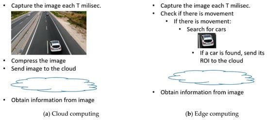The haartraining algorithm using OpenCV was used as a load on a video sequence. The video sequence is from a highway, where the passage of vehicles is controlled. In a cloud system, the system would capture and send all the images to the cloud to be correctly processed there. Images like that shown in Figure 4a would involve the entire image being sent to the central office for processing. In the fog computing system, the algorithm looks for the cars in the sequence, and only sends the ROIs (regions of interest) of the images where it has located vehicles, as can be seen in Figure 4b. Since it is a process that is costly in terms of computing requirements, this vehicle search process has not been executed on all the images, but only on those where a threshold of change between the images Ii and Ii+1 is exceeded (it is assumed that there is no alternative sensorization that indicates the presence of vehicles, either because it is a provisional installation where an attempt is made to economize on the installation, or because of the difficulties that may exist in the location of presence sensors that can perform this function. Therefore, this function will be carried out by means of multimedia processing [24]).