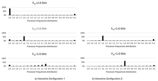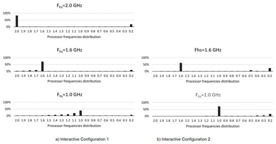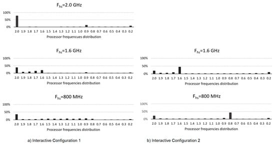 Figure 5 shows the distribution histograms of the core frequencies used with the two configurations: (a) with Fhs = 2 GHz, (b) with F′hs = 1.6 GHz and F″hs = 800 MHz. The same frequencies are included with configuration 1 for comparison purposes. As can be seen, when using Fhs = Fmax in configuration 1 (and as it is a process of high computational requirements) the frequency remains at its maximum value most of the time, being at its Fmin value, a very small part of the time. Using configuration 2 and the values F′hs and F″hs, it is clear that most of the time the core will work with that frequency, although sometimes it is necessary to increase the frequency value, but without reaching Fmax at any time. Using the same values of F′hs and F″hs but with configuration 1 (default), the results show how the core, even when remaining for some time in that Fhs frequency, the lower value of AHD means that it passes more easily to higher frequencies, including Fmax, so the consumption is higher but without providing a significant time difference. The reduction of the MST value can also be seen in lower use between Fhs and Fmin increasing the time in Fmin, which also favours the energy reduction achieved with configuration 2.