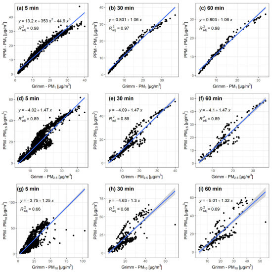 Correlation plots from collocating the portable Arduino based low-cost particulate matter (PM) measuring (PPM) unit with GRIMM. Rows present different sizes of particulate matter (PM1 (a–c), PM2.5 (d–f), PM10 (g–i)) and columns different time intervals (5 min (a,d,g), 30 min (b,e,h), 60 min (c,f,i)).