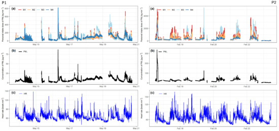 (a) Calculated intake dose of PM1 for all four models, (b) measured concentrations of PM1, and (c) heart rate in beats per minute. Left side for participant 1 (P1) and right side for participant 2 (P2).