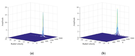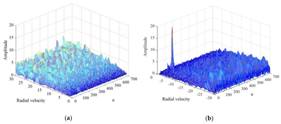 Simulation results of phase compensation and coherent accumulation: (a) Target detection with positive velocity ; (b) target detection with negative velocity .