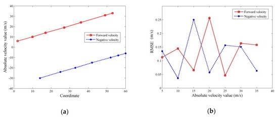 According to the characteristics of the proposed algorithm, there is a linear relationship in theory between the velocities of the moving target and coordinates of u axis. In order to verify the linear relationship in the u–v 2D graph, several speed values within the range of the target speed were randomly selected to be the simulation parameters, then the proposed algorithm was applied to obtain the estimated velocity of the moving target. Via acquiring multiple estimated velocity-coordinate value pairs, on the one hand, the corresponding relationship between them can be verified and, on the other hand, the effectiveness of the proposed algorithm for detecting the moving target can be proven. In the simulation results, as shown in Figure 3a, there is a linear relationship between the estimated values of speed and the coordinate values. The linear relationship of the estimated positive and negative velocities with the corresponding coordinates can be expressed as and , respectively, where denotes the estimation of positive velocity, denotes the estimation of negative velocity, , , , and are the coefficients of linear fitting, and denote the coordinate values in the u–v 2D graphs. Moreover, these coefficients, , , , and , can be obtained via least squares estimation with the estimated velocity-coordinate value pairs. In simulation, we obtained the root-mean-square error of velocity estimation as follows.