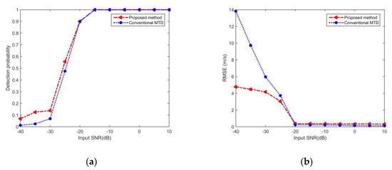 Performance comparison: (a) Detection probability over input SNR; (b) Speed estimation error over input SNR.