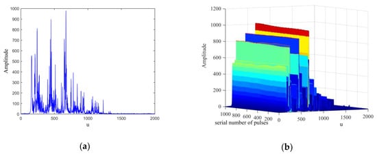 By selecting the appropriate number of coherent cumulative pulses m, the echo of the ground object can approach zero in the fractional domain (i.e., ). Note that the FRFT of a Gaussian function contains complex variables [31], and during coherent processing, the noise converges to zero in the fractional Fourier domain. Therefore, the transformation in Equation (1) after phase compensation and coherent accumulation can be expressed as