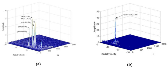The results of applying the proposed algorithm on the measured data are shown in Figure 6a. Phase compensation and coherent accumulation of positive velocity retrieve five effective peaks, with coordinates (250, 10.5, 4.099), (254, 25, 11.43), (236, 16.5, 13.8), (196, 13.5, 16.27), and (248, 20, 17.88) for respective speed estimates of 10.5, 25.0, 16.5, 13.5, and 20.0 m/s. As shown in Figure 6b, the phase compensation and coherent accumulation of negative velocity yields one effective peak with coordinates (226, −22.5, 42.89) at an estimated speed of −22.5 m/s.