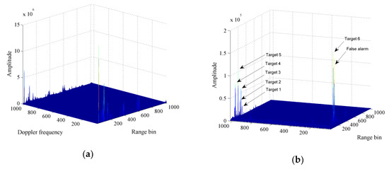 Moving target detection (MTD) algorithm applied to ground vehicle detection. (a) Range-Doppler plane without cancelling fixed objects; (b) range-Doppler plane with six true targets and a false alarm after eliminating zero frequency and four adjacent frequencies.