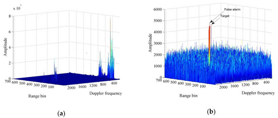 MTD algorithm applied to unmanned aerial vehicles (UAV) detection. (a) Range-Doppler plane without cancelling fixed objects; (b) range-Doppler plane with a true target and several false alarms after eliminating zero frequency and four adjacent frequencies.