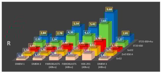 Test results from ST25 650+Au, ST20 650, SnO2, ZnO 850, and SnS2 sensors on the Dulbecco’s modified Eagle’s medium (DMEM) breeding ground, fibroblasts, and human embryo kidney cell (HEK-293) samples, incubated for the same time (48 h).
