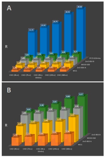 Each sensor was put to its best working temperature, defined by laboratory tests (carried out in the laboratory of sensors of the Department of Physics and Earth Sciences, University of Ferrara) on the tumor markers previously studied, chosen from the literature [,,,]. The variety of sensors chosen lays upon the will to verify if chemoresistive sensors can detect variations as a whole technology, or if only some particular semiconductors can be used for screening/detection purposes, and to visualize possible correlations between their response behaviors. Further details in the sensors’ functioning, the differences between the various semiconductor materials, and their characterizations can be found in literature [,,,,,,,,,,,,,,,,,,,]. The responses are standardly defined as the average value between three output voltages measured by the sensor from the same sample, as shown in the following formula []: