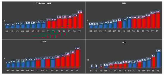 Concerning the blood tests, three sensors (TiTaV, STN, and ST25 650+Au) showed good capability to distinguish between healthy and tumor affected donors just from the amplitude of their responses (Figure 4, Table 5 and Table 6), even with the incapacity shown in sensors STN and TiTaV to fully distinguish patients T1 and T2 from healthy specimens. This depends on the fact that smaller and less aggressive tumors emanate smaller quantities of different metabolites and VOCs when compared to more aggressive or bigger neoplasms, as was proven in both the histological exam (which confirmed the different size and aggressiveness of the tumoral formations) and by comparison with ST25 650+Au, which instead could distinguish them as the less polluting cancers for the circulatory system by their mere observed responses. This is a huge confirmation of the work carried out on these particular sensors, since those materials were explicitly chosen from the assessments that the team could finalize from previous works [,,,,,,], sealing the reliability of some semiconductors for neoplasms screening in vitro applications.