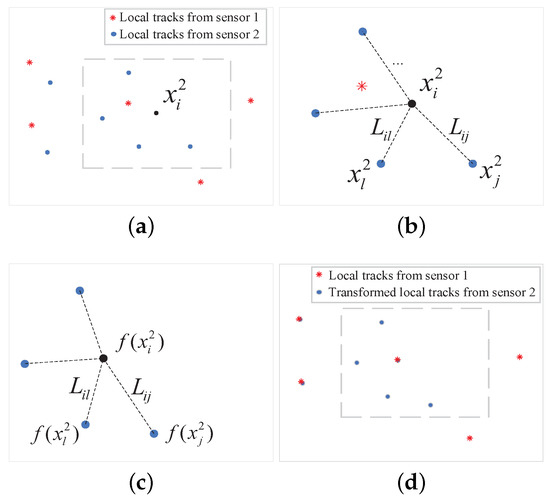 The transformation f uses the relationship between local tracks from different sensors, but does not consider the relative geometry between one track and its neighbors from each sensor. The geometry is inspired by the idea that the relationship between a local track and its neighbors from different sensors could be preserved after the transformation, as depicted in Figure 2. To ensure an accurate T2TA, a geometrical constraint on the local tracks is proposed in this paper. A schematic illustration of the geometrical constraint is given in Figure 2.