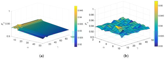 Parameters and represent the trade-off regularization terms. The ranges of these parameters were determined experimentally. The correct association probability defined as the ratio of the correctly assigned tracks over the total number of tracks is employed as the primary metric for performance evaluation. The variation of with regularization parameters and at time step k = 50 is shown in Figure 4. It is observed that the proposed method performs best when and . Here, we set = 6, and = 15.