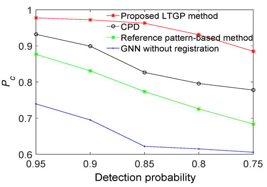 Correct association probabilities of GNN without registration, reference pattern-based algorithm, CPD algorithm and the proposed method for different detection probabilities.