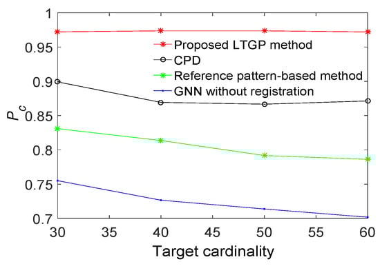 The performance of the proposed method is demonstrated next relative to those of GNN without registration, the reference pattern-based algorithm [33], and the CPD algorithm [35]. All results are averaged over 50 Monte Carlo runs. The proposed method achieves the best performance, as illustrated in Figure 6. Compared to the reference pattern-based algorithm, the CPD algorithm improves the by about 8%. The of the proposed method has improved by 5% as compared with the CPD algorithm. Furthermore, the results for a scenario with varying detection probabilities and different numbers of targets are respectively illustrated in Figure 7 and Figure 8. It is observed that the proposed algorithm outperforms the other three benchmark algorithms. From Figure 7, the performance of GNN without registration, reference pattern-based algorithm, and CPD algorithm degrade rapidly with a decreased detection probability. From Figure 8, the performance of the proposed method is almost constant while increasing the number of targets. Moreover, the average of the proposed method is improved by approximately 9% as compared with the CPD algorithm.