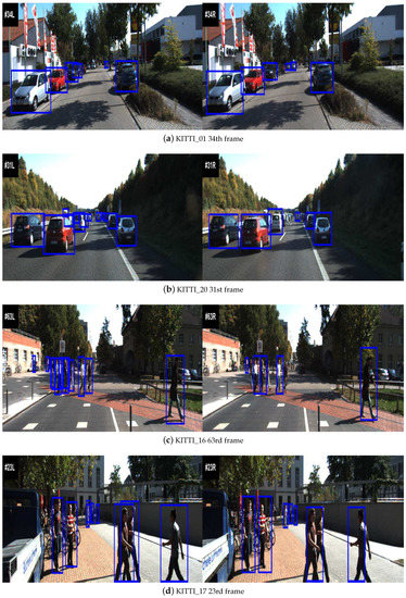 In this section, we evaluate the proposed algorithm using the KITTI dataset. Here, the KITTI multi-object tracking dataset [43] is applied to evaluate the proposed data association method. The vehicle tracking test sequences 01 and 20, and pedestrian tracking test sequences 16 and 17 are used. Each sequence consists of 30 frames. Figure 9 depicts the starting frames of left and right cameras for each sequence along with the results of object detection. For the left camera, the detection results of vehicle or pedestrian are provided by the ground truth. Meanwhile, the deformable part model detector method [44] is proposed to detect vehicle or pedestrian for images of rthe ight camera.