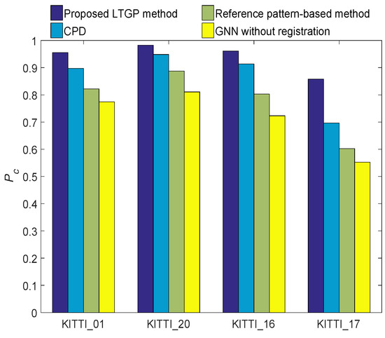 The ground truth matching between the left and right images in each frame is confirmed by manual annotation. The GNN without registration, the reference pattern-based algorithm, the CPD algorithm, and the proposed method are employed to associate the local tracks. The average T2TA matching accuracy performances of different T2TA methods are depicted in Figure 10. It is confirmed that the performance of the proposed method is substantially better than those of GNN without registration, the reference pattern-based algorithm, and the CPD algorithm. Compared with the CPD algorithm, the average performance of the proposed method is improved by about 7.8%. In addition, since the KITTI sequence 17 contains large pedestrian occlusion while the motion is more than the other sequences, the performance gap between this and other sequences is more evident. The proposed LTGP method has better performance compared to three benchmark algorithms in the KITTI sequence 17. It is because the proposed method preserves the geometry of local tracks in the data association. The average run-times of these algorithms are given in Table 1, which reveals that the proposed LTGP method has higher computational complexity compared to the GNN without registration, reference pattern-based, and CPD methods.