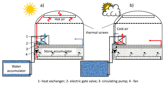 Hence, the two analyzed types of accumulators can be recommended for horticultural practice, with the water accumulator preferred for short-term heat storage (e.g., when using it to heat water dedicated to plant irrigation) or to heat the greenhouse air at sunrise to prevent condensation of water vapor on slowly heated fruits or plants.