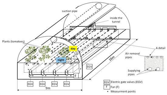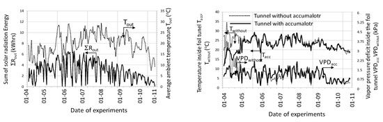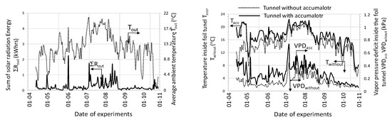 Other parameters necessary to determine these relationships for each cycle (enthalpy—H; absolute air humidity—C) were calculated using psychrometric relationships. In order to compare the observed changes in environmental conditions inside the tunnels studied, the water vapor pressure deficit (vpd) was also calculated for the air in tunnels with and without a accumulator (control tunnel). In both tunnels, the same density of plants was used during the experiments and the construction of tunnels and control of the position of roof vents were identical.