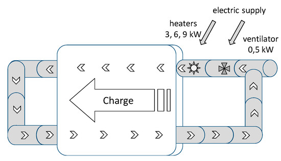 The diagram (Figure 5) shows the process of charging the PCM accumulator. Heaters supplying heat to the accumulator were switched on sequentially depending on the available power of a photovoltaic power plant, while a 0.5 kW axial fan was responsible for the distribution of the heat flux in the air.