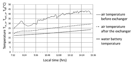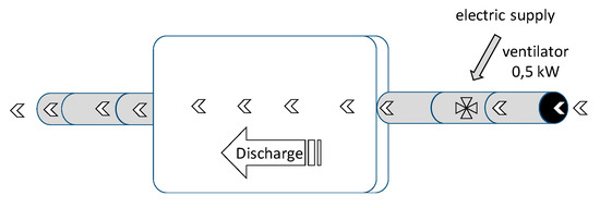 The process of discharging the PCM accumulator (Figure 6) consisted of receiving heat accumulated in the paraffin by means of an air stream flowing through the bed. For this purpose, the fan used earlier in the accumulator charging process was employed. The useful heat in this process was the difference between the air enthalpy at the output and the input of the PCM accumulator.